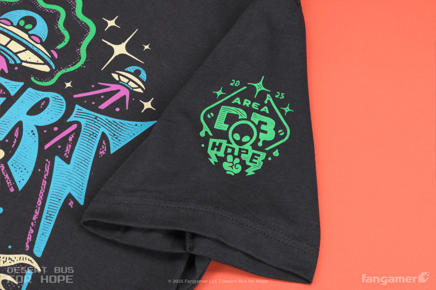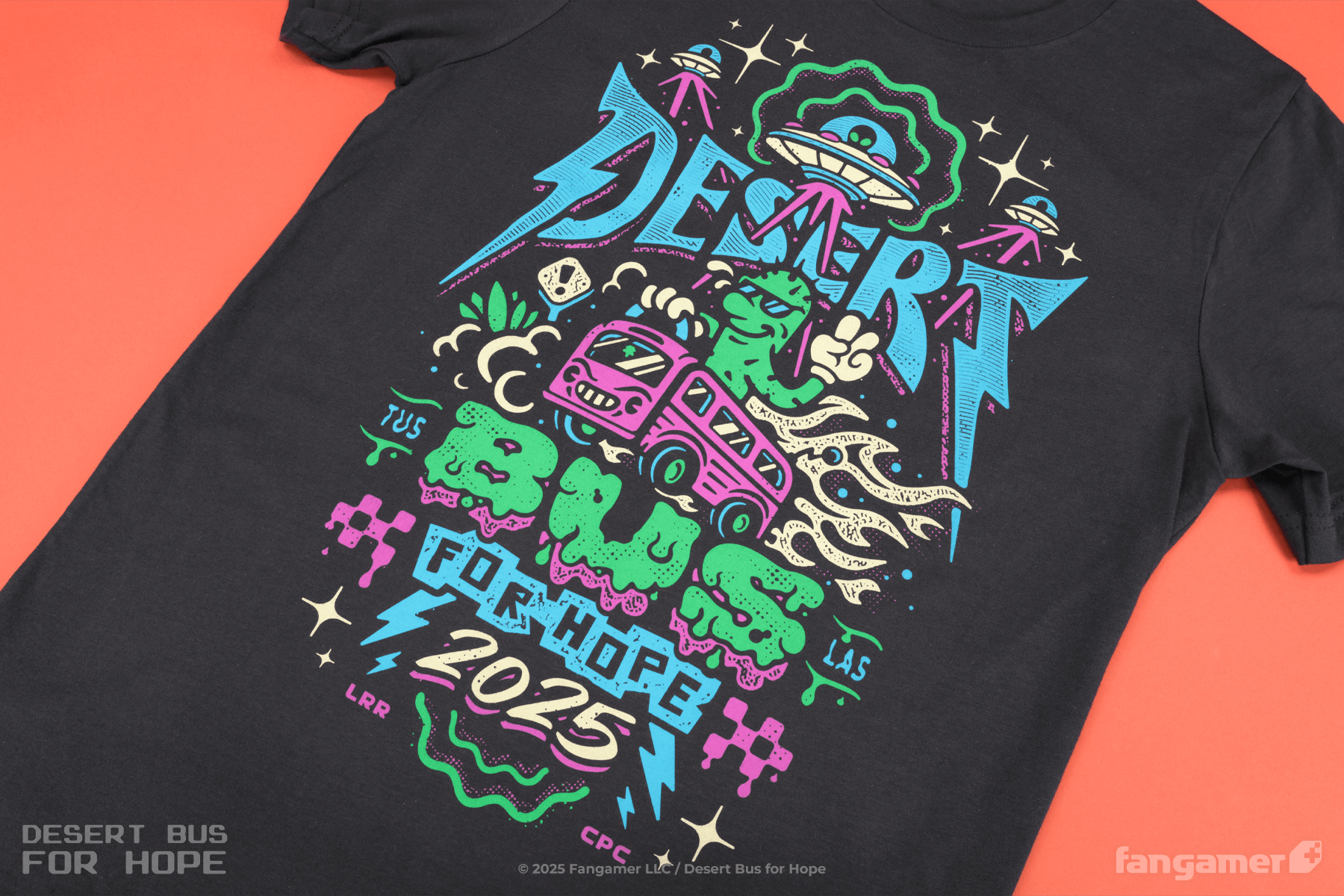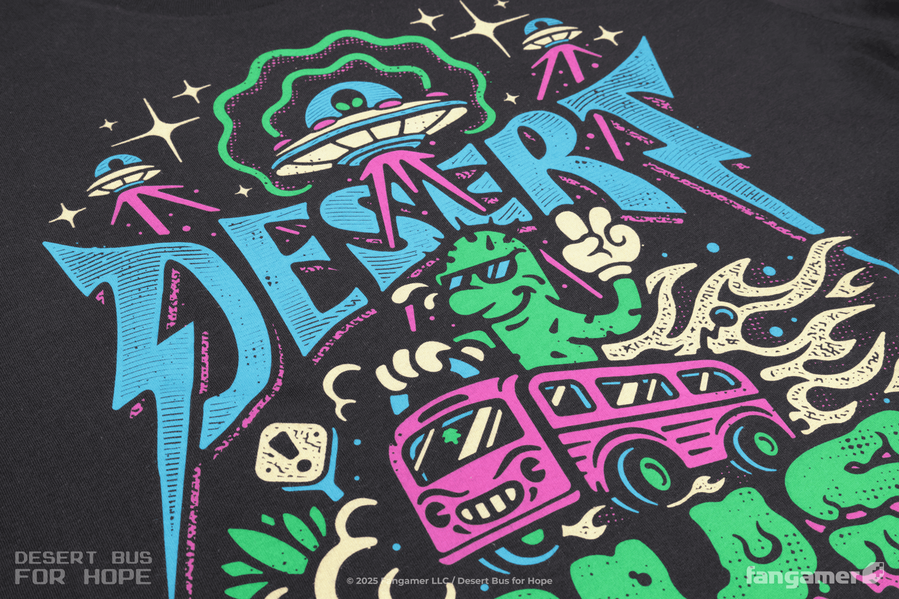The Desert Bus, so far as we know, is not actually driven by the desert—but Jon Kay's latest event shirt offers a compelling alternate reading of the title.