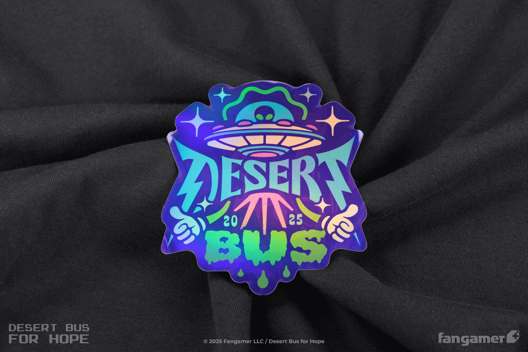 For the first time in Fangamer Desert Bus shirt history, we think—only the VST knows for sure—this shirt includes a bonus sticker! It's about 3.4 inches tall and printed on holographic paper.