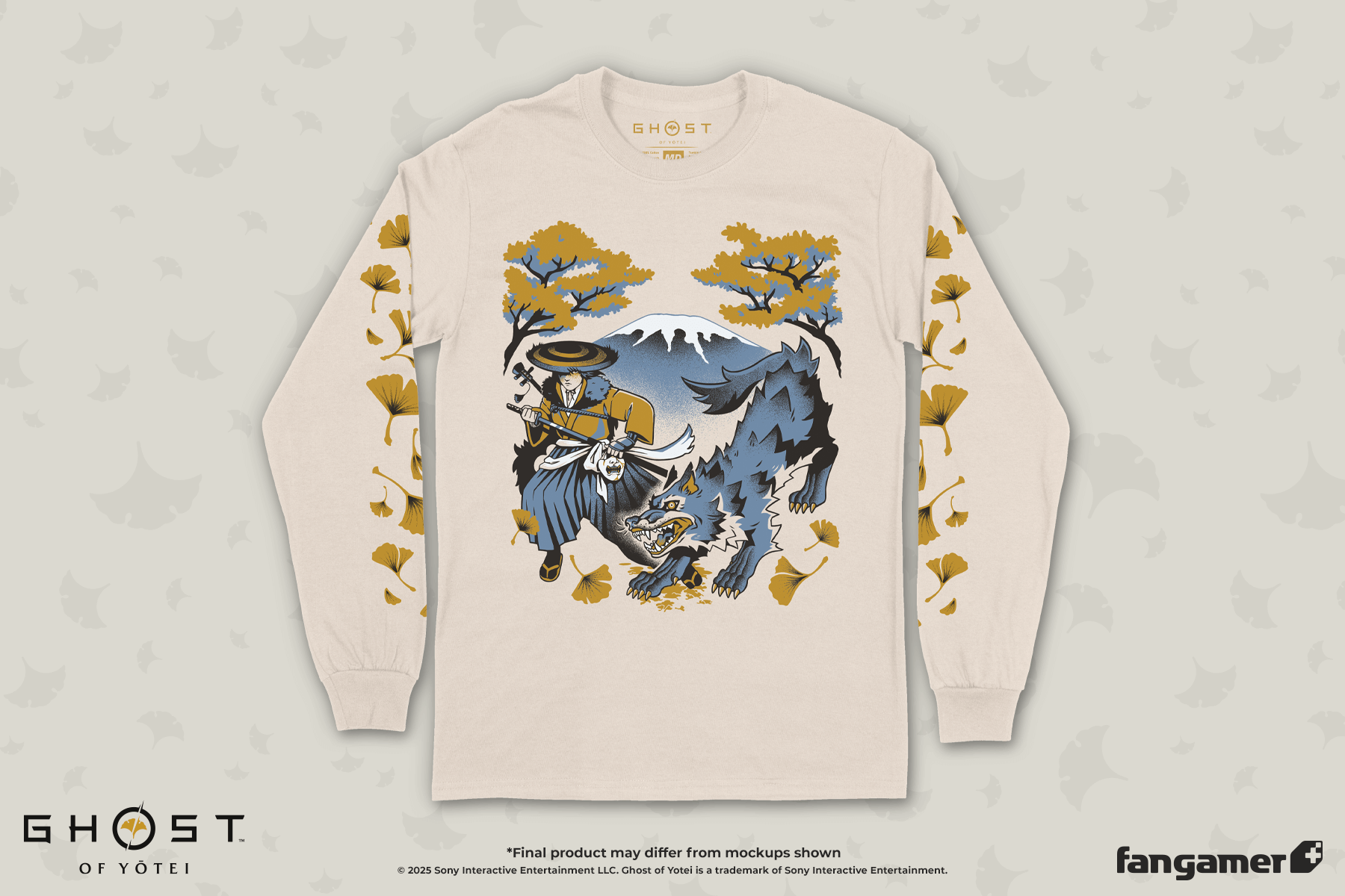 This official Ghost of Yotei long-sleeved shirt was designed by Melora Mylin and printed by Forward on 100% cotton garments from Port & Company.