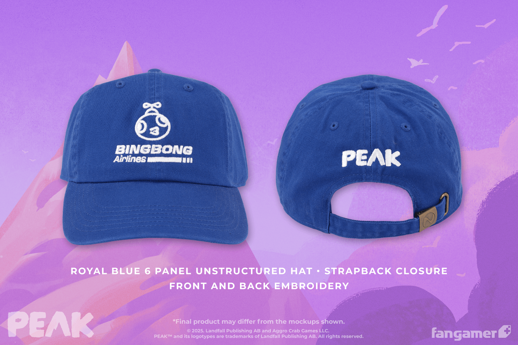 This official PEAK hat was designed by Tony Kuchar. It's an unstructured strapback cap, embroidered front and back with the BINGBONG Airlines and PEAK logos.