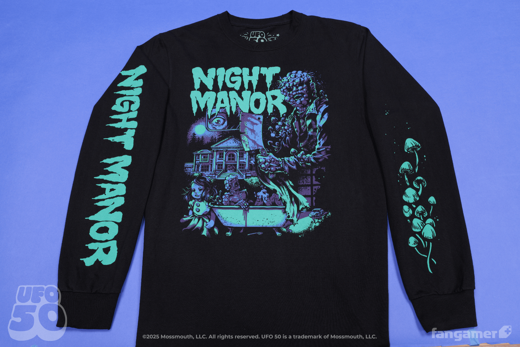 The right sleeve reads "Night Manor"; mushrooms climb the left sleeve.