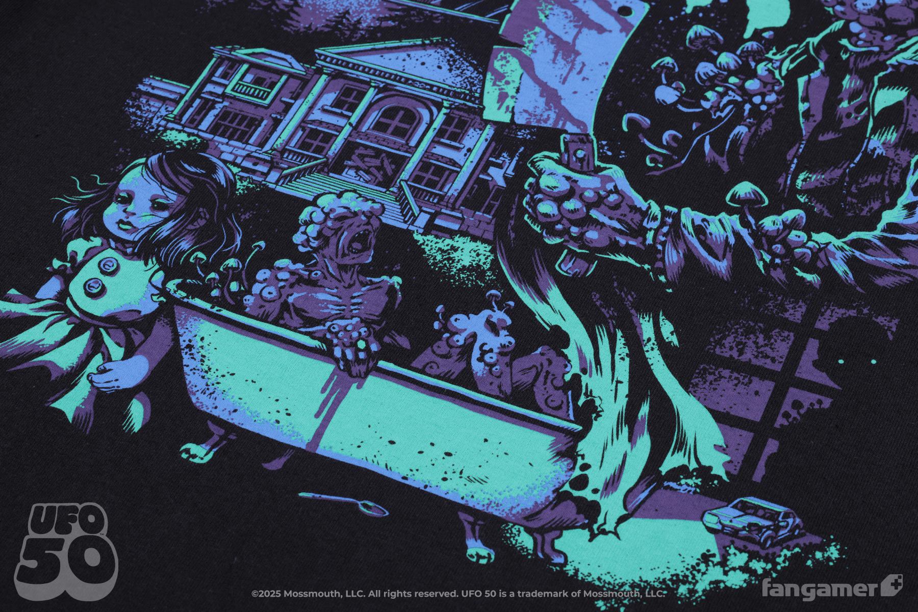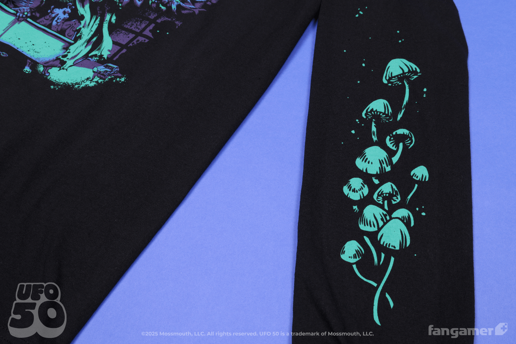 This official UFO 50 long-sleeve shirt was designed by Nina Matsumoto and printed by Forward in three locations on 100% cotton garments from Port & Company.