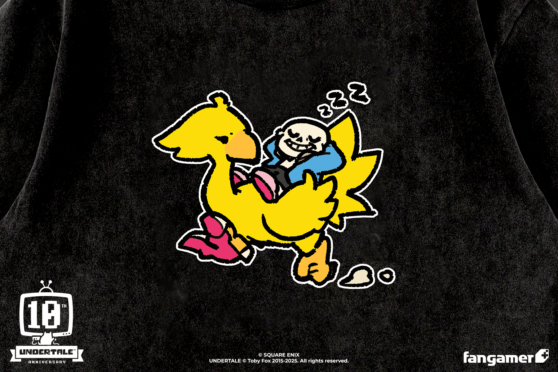 A new t-shirt featuring an original illustration by Temmie Chang is now available! This shirt prominently features the Chocobo from the Final Fantasy series and Sans from UNDERTALE.